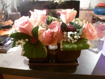 Voila une décoration de table faite par mon épouse avec quelques roses et de la verdure du jardin
