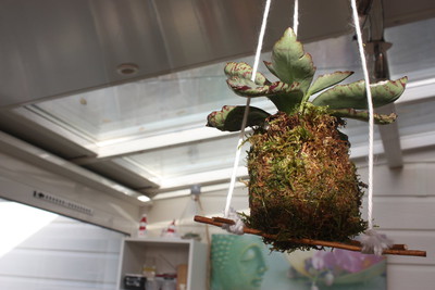 Cette suspension est le cours d'art floral du mois de décembre, je ne sais pas le nom de la plante sauf que c'est une plante grasse